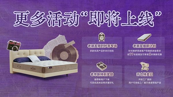 ·老朋友焕新计划:针对美梦思老客户的焕新床垫需求,前99名老朋友可享受5折焕新优惠;