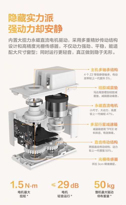 Aqara 智能隐形窗帘电机 C200 内置 1.5N·m 大扭矩永磁直流电机,最大可承重 50kg 帘布,动力强劲,运行噪音低至 29dB,达到睡眠级轻音水准。