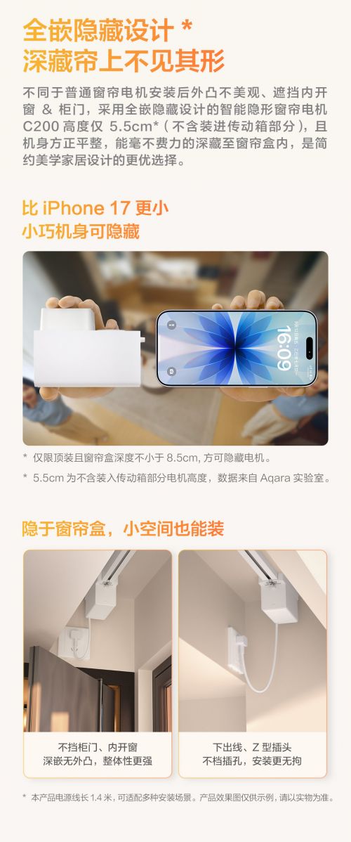 目前,隐藏式设计正逐渐成为智能窗帘的主流选择。Aqara 智能隐形窗帘电机 C200 采用纯白方正机身,高度仅 5.5cm,可完全嵌入窗帘盒内,既保证整洁美观,又大幅提升空间利用率。不同于传统柱式电机,C200 深嵌无外凸,不易遮挡柜门、内开窗,同时因机身高度更低,制作窗帘盒的用料更省。整机平整简洁,采用下出线设计与 Z 型插头,布线合理、不占额外空间,让窗帘与家居环境自然融合。