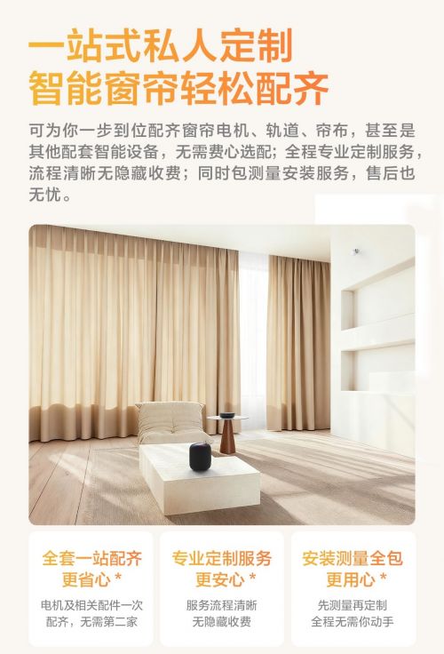 作为可实现一站式定制的隐藏式智能窗帘,Aqara 智能隐形窗帘电机 C200 配套提供了定制轨道与多款高定帘布的一站式配齐服务。用户在下单后可提供测量与安装服务,从选购到落地皆省心省力,无需再费心选配。C200 支持直轨 / L 轨 / U 轨三种定制轨道,精准适配多样窗型;可选梦影帘 / 韩褶帘两种制作样式,让用户轻松拥有兼具美学与品质的家居氛围。