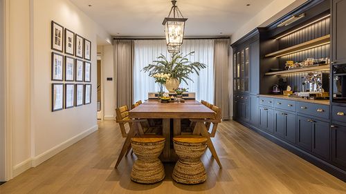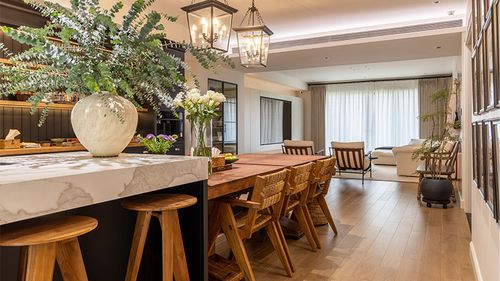 “希望从推开家门的那一刻开始,得到无尽的放松,而一年四季中,秋天对我和老婆来说是更加惬意且放松的季节”,于是他们决定把“秋景”装进家。设计师从陈先生提供的一张秋天爱人在树林里的照片中捕捉灵感,确定了整个家装的秋意基调,并将照片中的颜色、质感与环境巧妙融入到家的设计中。例如木色的层板、藤编的椅、木地板的颜色等诸多元素,都是参照秋天林间的颜色去进行特别定制的,力求让整个家居空间更加淳朴、更有生命力、更贴近自然。