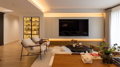 其中木地板的选择尤为关键,陈先生谈到他们这一代年轻人,不会像父母那一代基于各种原因去选择瓷砖,而是会更加注重回归个人的使用感受,选择能够提供更温润的脚感以及更能令自己放得开的木地板,即“更新生代的人想要更原生态、更舒适的环境”。同时,因为回家进门的第一个接触点就是脚感,全屋铺实木地板能够让踏进家的第一步就是温润舒适的,进而营造出一个全方位放松的场景氛围,这点也更契合陈先生最初想要“无尽的放松”的装修核心需求。因此,在经过前期调研与反复对比后,陈先生和设计师最终决定使用天格地板栎木定制款。