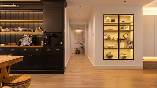 其实除了木地板,陈先生家中的每一处陈设都凝聚了他和设计师大量的时间与心血,包括:客厅里的原木墩子、桌上点缀的金灿灿的落叶端景、增加厚重感的深色系混油橱柜、灯具的搭配、适当的留白……这些所有与秋天有关的颜色、质感、环境精心融合在一起,共同构筑了陈先生与爱人理想的“秋日系的家”。这个家,不仅让他和爱人收获了一份令人欣喜的30岁的礼物,更为未来宝宝准备了一个健康原生态的成长空间。