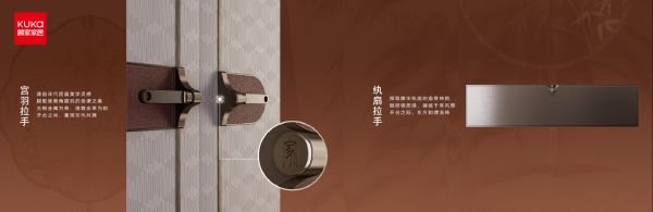 其中宫羽拉手源自宋代团扇美学灵感,撷取宫商角徵羽的音律之美,以古铜金属为骨,落霞皮革为韵,开合之间,重现宋代风雅;而芙蓉装饰柱则引用“清水出芙蓉”的诗意,鎏金线条勾勒圆润之姿,整体采用分段设计,写意东方韵律;纨扇拉手则撷取唐宋纨扇的扇骨神韵,咖啡铜质沉稳典雅,轻转之间,仿佛千年文化在指尖悄然流转。