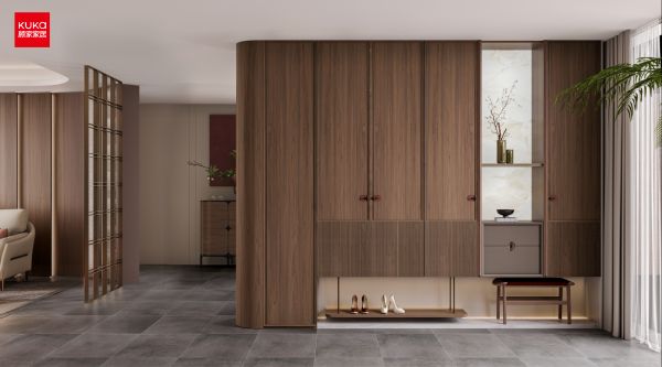 在功能设计上,鞋柜从左到右系统化布局多功能区域:鞋物藏纳区、便捷悬挂区与大容量储物单元依次铺展,在保证视觉秩序的同时,满足现代生活的高效收纳需求,将万象收纳融于简约形式,既彰显东方美学的藏露哲学,亦实现了实用与审美的统一。