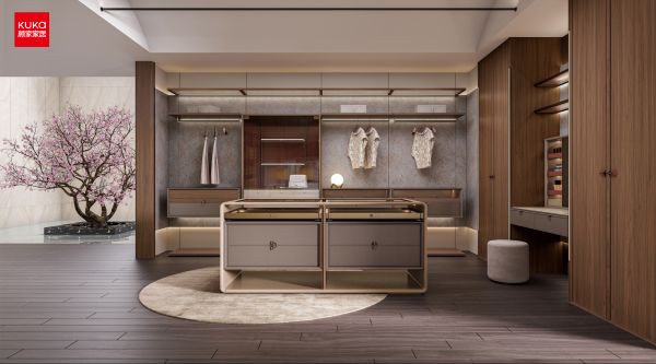 步入式衣帽间以玻璃发光层板构筑轻盈视觉,光线自层板间漫射而出,虚实交错,呈现出通透而时尚的空间气质。整体布局融合智纳乾坤收纳系统,兼顾开放式展示与隐蔽储物的双重需求,在精致秩序中实现功能与美学的统一。梳妆区与衣柜无缝衔接,形成流畅高效的生活动线,从晨起理容到更衣着装,一举一动皆从容有序,诠释出现代东方语境下“藏露有度、仪态自若”的居住智慧。