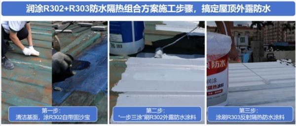 润涂R302+R303防水隔热组合方案在施工工艺上实现重要突破。R302产品自带固砂宝成分,可清洁基面后直接涂刷封闭基面,不用额外购买固砂宝,实现一料双效。