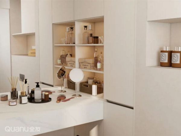 若空间较为狭小,也可利用台面与衣柜连接处设计开放格,化妆品、饰品上柜收纳,节省桌面空间,视觉更整洁。