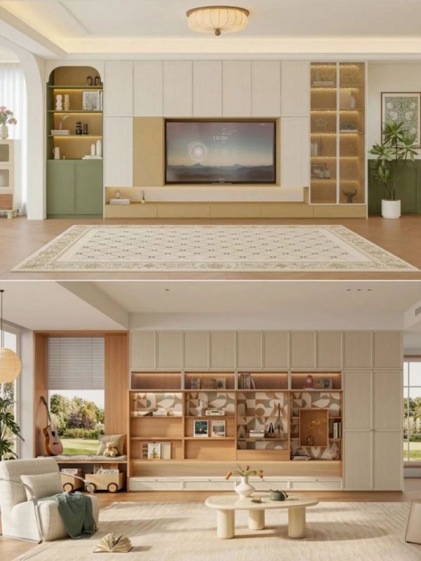 若无看电视需求,可定制整墙书柜或储物柜,搭配移动画框电视或投影仪,将客厅转变为多功能区。