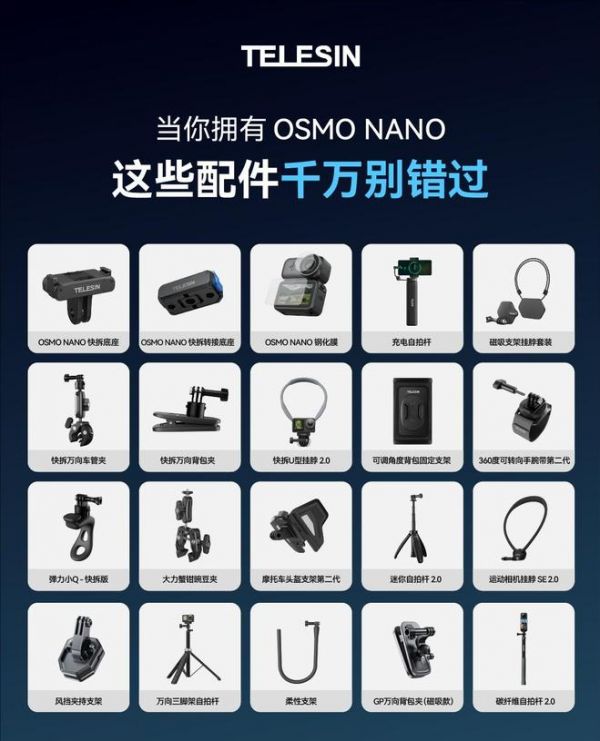 从 “专属定制核心件” 到 “17款全场景周边”,TELESIN 为 Osmo Nano 构建的配件生态,不仅是设备的 “延伸”,更是创作的 “放大器”—— 无论你是记录日常的 vlogger、热衷户外的探险家,还是追求新鲜视角的创意达人,都能在这套体系中找到 “提升体验的密钥”。