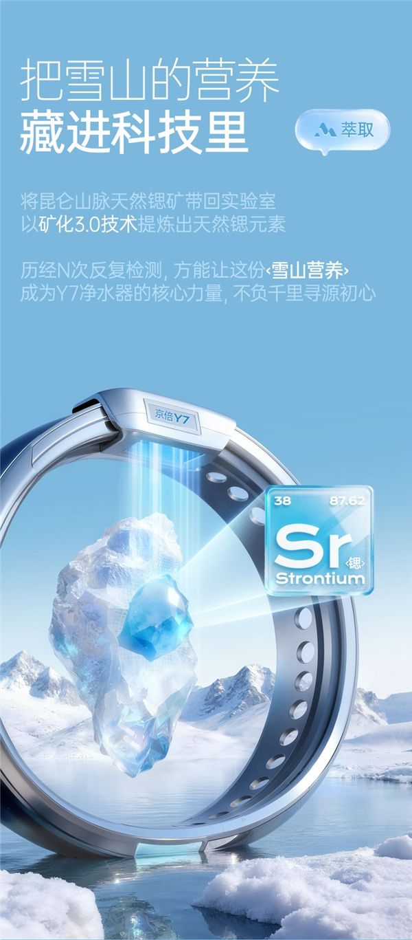 “净水器过滤掉了杂质,也滤掉了矿物质”—— 这是长期困扰净水行业的核心矛盾。据太平洋科技实验室 2025 年测试数据显示,传统 RO 净水器过滤后,水中矿物质保留率不足 10%,导致 “净化水口感寡淡、缺乏营养”。9 月 20 日,京倍 Y7 净水器发布的 “矿化 3.0 技术”,通过将昆仑山脉天然锶矿带回实验室,以矿化3.0技术提炼出天然锶元素。