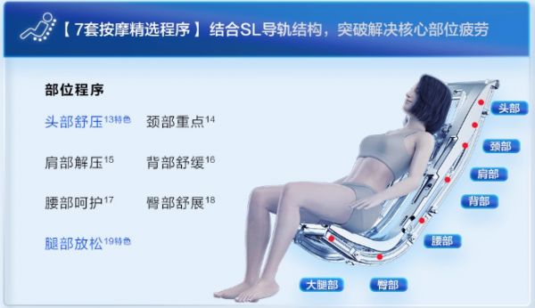 ●加长SL导轨,无论是小憩还是正式按摩,都能贴合身体曲线。(低价按摩椅通常是固定机芯+直导轨/S导轨,但伪装成SL导购,千万不要上这个当)