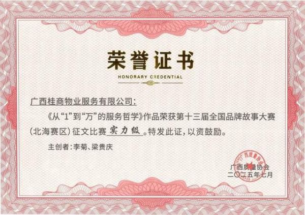 此次斩获两项殊荣,既是对桂商物业品牌文化建设成效的高度认可,也为公司持续深耕品牌、提升品牌价值注入了强大信心。下一步,桂商物业将以此荣誉为动力,不断强化品牌意识,深入挖掘优质品牌,努力讲好品牌故事,为传播企业优质形象增添新动能。