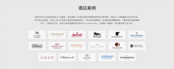 舒达已和海内外多家知名酒店品牌达成长期深度合作,其中包括希尔顿、洲际、万豪、雅高等国际酒店集团。在中国,舒达已入驻1400多家五星级和度假型酒店,为更多在路上的旅者提供舒睡好眠,缓解差旅疲倦。