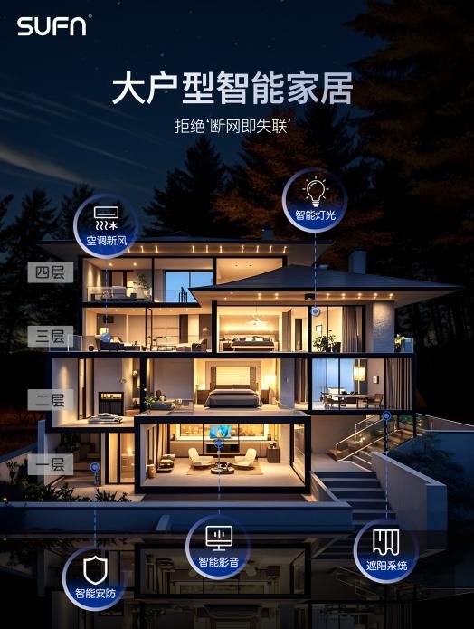 革命性本地化跨网关技术——依托自研的SUFN OS系统,添悦系列实现了关键性技术突破——本地化跨网关功能。即使在多层别墅断连网关、各楼层断连路由的极端情况下,设备依然能够保持互通互联,丝滑运作。这一创新彻底解决了传统智能家居“断网即瘫痪”的行业痛点,让无线智能在高端大户型别墅领域的应用迎来黄金时代。