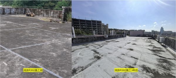 解决方案:2022年,使用R302外露型防水涂料对屋顶进行全面涂刷翻新,重点处理女儿墙、接缝等易渗水部位,用堵漏宝做了节点处理,采用一布三涂工艺涂刷3遍R302外露型防水涂料,涂层厚度达1.5mm,有效覆盖裂缝并增强基层强度。