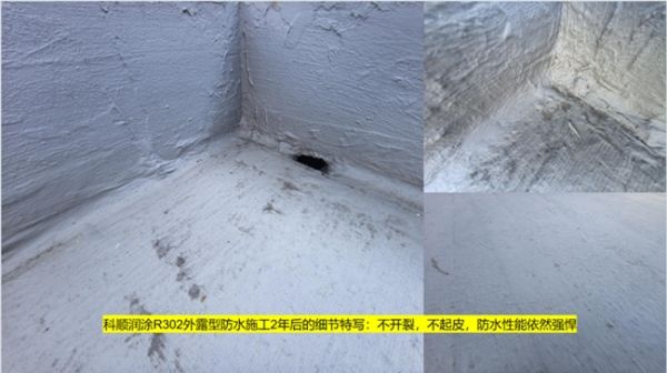解决方案:采用科顺润涂R302外露型防水涂料进行全面一布三涂工艺进行施工涂刷,涂层厚度1.5mm。