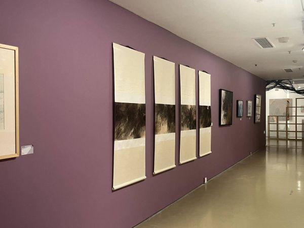 提取自二月蓝花瓣自然紫调的“二月兰花”墙面,应用了卡百利净醛瓷釉肤感纯色艺术漆,像婴儿肌肤般细腻的墙面,不刺眼却足够提亮,让画作里的线条和色彩层次更分明,像一场无声的对话,把观众的目光自然引向作品本身;而“麦浪”色则以温暖柔和的米黄色调,营造出自然质朴的展陈氛围,让观众在沉浸中感受传统色彩与当代设计的和谐共生。观众驻足时,墙面肌理与画作笔触的呼应,仿佛将“实用美术”的经典理念从画布延伸至空间本身。