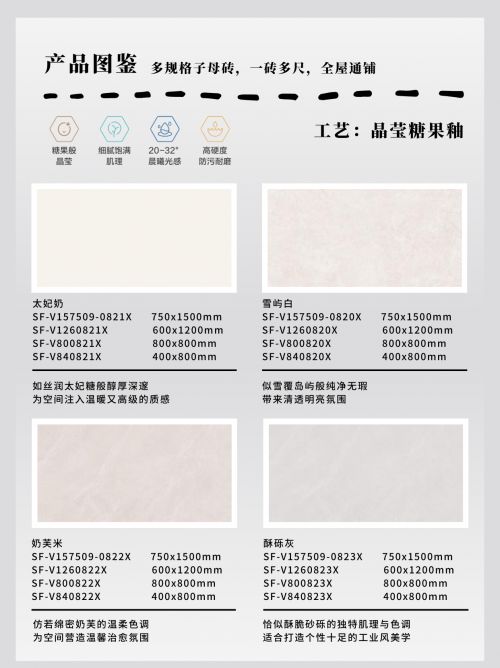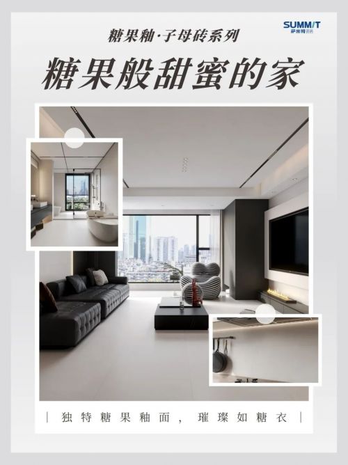 “家的第一印象,该像糖果般藏着惊喜”——正是这份对温柔的执念,让萨米特开启了长达18个月的“熬糖实验”,最终淬炼出糖果釉系列新品。该系列采用“晶莹糖果釉”工艺,让瓷砖触感拥有介于绒布与细沙之间的细腻与温柔,如晨露吻过花瓣,又似月光漫过琴弦。