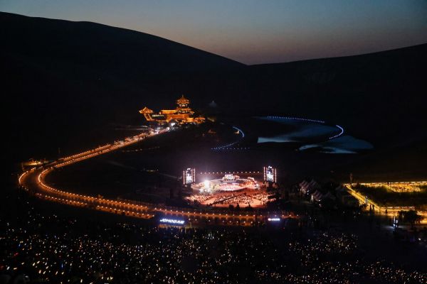 当夕阳的最后一抹余晖倾洒在连绵沙丘上时,当明亮的月光映照在碧蓝的月牙泉上时,九牧全球音乐季在万人欢呼声中盛大开唱。知名歌手莫文蔚、摇滚乐队、流行新秀接连登场,以激情四射的歌声唱响敦煌,让音乐的纯粹与电子乐的动感在广袤沙海间激烈碰撞。特别是莫文蔚倾情献唱了《忽然之间》、《如果没有你》、《电台情歌》、《豹变》等多首耳熟能详的国民歌曲,引发全场观众大合唱,游客和粉丝们手持荧光棒摇曳舞动、手舞足蹈,嘹亮歌声响彻月牙泉星空。