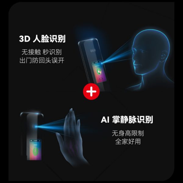 C7Pro使用3D人脸识别与AI掌静脉识别,人到锁开,入户无接触、无停留。特别具备“防回头误开”发明专利技术,有效杜绝离家锁门后,因确认锁门、等候电梯等门前停留导致的自动人脸识别误开门风险。掌静脉识别,无身高限制,不受手掌表皮磨损、潮湿、污渍的影响,适配全年龄段家庭成员,有效解决了老人小孩使用指纹识别率低的问题。
