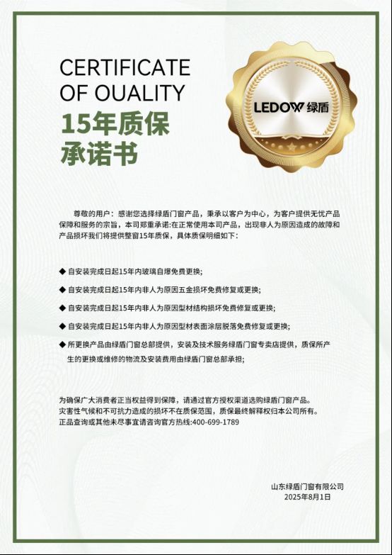 科技创新引领行业发展,绿盾首创的自洁净醛技术,向客户承诺承诺整窗15年超长质保服务,更是保证15天快速入住,在消费升级与健康需求双重驱动下,这份质保承诺书,既是绿盾对自身产品的信心,更是有让消费者安心的底气。