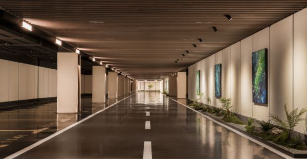 融创壹号院全新实景区域的一大亮点,在于对“归家动线”的定制设计和建造品质的完整呈现。其中,社区大堂的呈现令人印象深刻,贝母艺术穹顶呼应细腻的暖色石材地面,营造出回家的暖意与仪式感。从社区入口到单元大堂、从地下车库到电梯厅,各处空间注重了材质搭配与光影氛围,归家过程松弛且有序,有如高奢酒店式的礼制体验,使客户能够直观感知未来的生活图景。