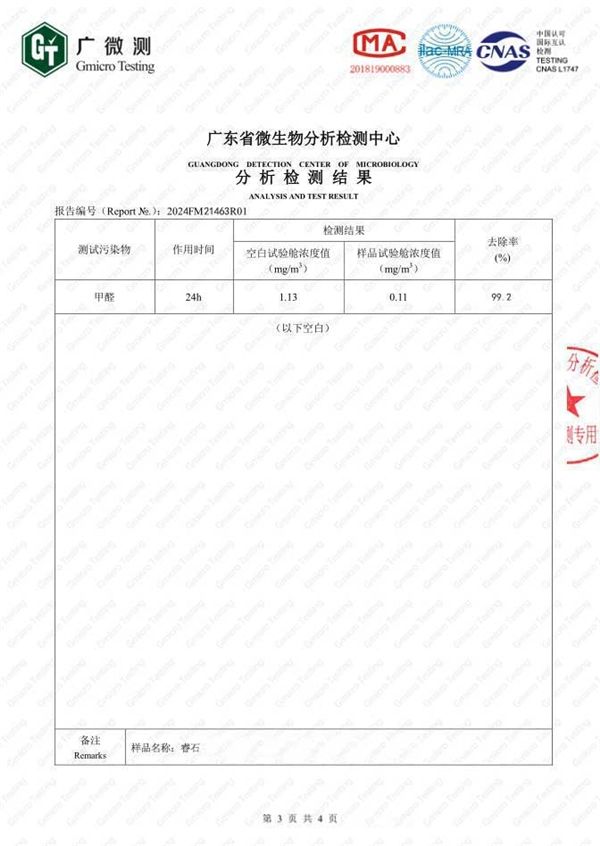 睿石是一种天然形成的盐矿石,睿石经高温活化后其内部拥有与甲醛分子尺寸相仿的发达孔隙结构,以及独特的"单向锁闭"特性,能强力吸附并永久锁定甲醛等有害物质。