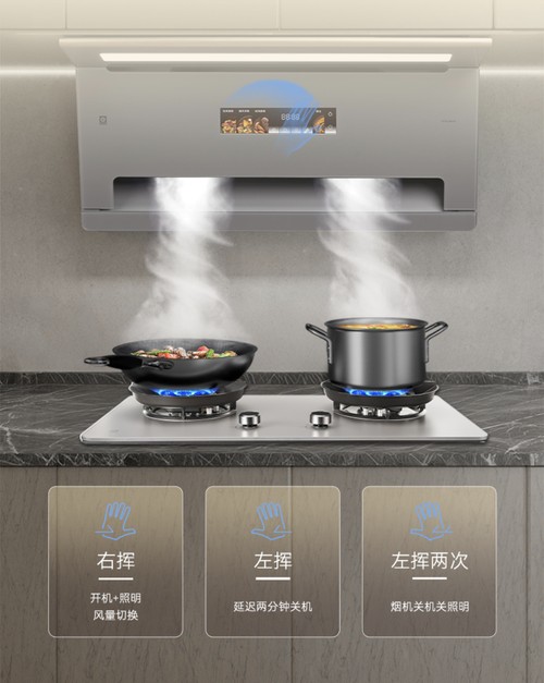 更令人心动的,是科技与日常之间那份不言而喻的默契。樱花御风吸油烟机Q660M配备智能体感操控系统,只需轻轻挥动手臂,即可完成吸油烟机的启停与调档,无需触碰的洁净交互体验,让烹饪过程更加优雅。