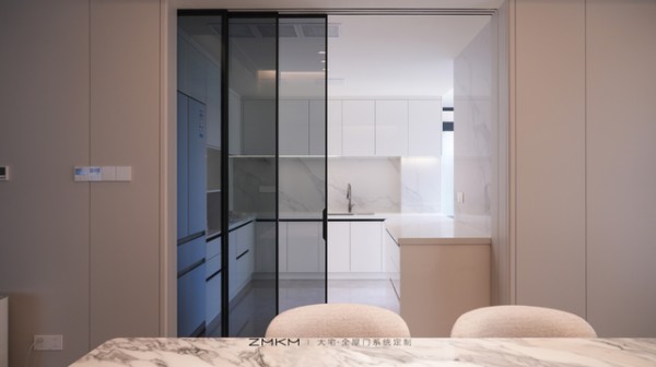 其实,理想的厨房移门应该是这样的:打开时,厨房与客厅完全连通,形成一个开阔的整体空间;关闭时,能有效分隔功能区,却又不影响光线和视觉延伸。而ZMKM芝麻开门家居仅用一扇门解决这些痛点。