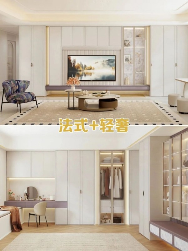 萃取法式美学的浪漫精髓与现代空间的秩序感。香槟金色边框与精心设计的灯光和谐相衬,使得空间的浪漫仪式感与精致华丽感得以并存。