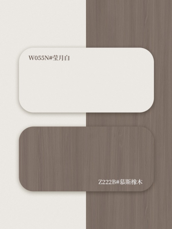 莹月白纯净柔和,搭配烟熏胡桃木的深邃质感。这套组合理性而温润,非常适合营造宁静且有深度的现代简约空间。