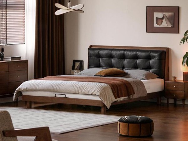 鲸澜·软靠床【黑标】,以其浑厚的体量与考究的用料,甄选北美FAS级黑胡桃木为主体,辅以南洋金檀木背板与山毛榉框架,每一寸纹理都在诉说着岁月的沉淀。饱满的软包靠背,将硬木的刚毅转化为温柔的倚靠支撑,让休憩成为一种仪式感的享受。