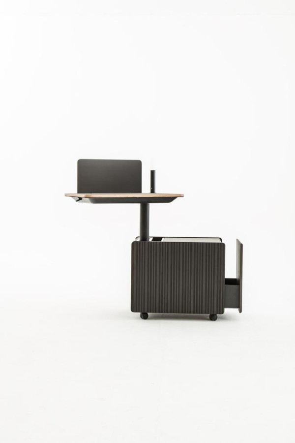 产品介绍:随着数字牧民的日趋流行,以及ABW办公方式在企业的常态化。Boxwork迷你工作站应运而生。其可作为移动升降办公桌、收纳柜,boxwork的多功能性可以满足员工专注办公,协作讨论以及会议分享等各类办公形式的需求。台面采用毛毡挡板,多变的形式消解日常工作中的单调与枯燥,通过视觉效果营造场景仪式感,创造惊喜和乐趣,与台面磁吸式固定,轻质化的产品语言弱化产品的体量,表现出产品的移动性特点。Boxwork台面可通过无线电动升降,740-1050mm可调,满足站坐交替健康办公需求。另外,台面可180度旋转,共6个档位,以适应多变的使用形式和人体姿势的变化。