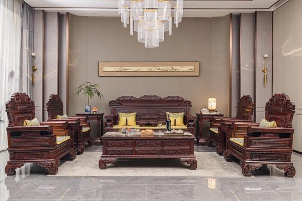 古森红木产品《祥云沙发》,雕刻纹样寓意仕途顺遂、胸襟开阔