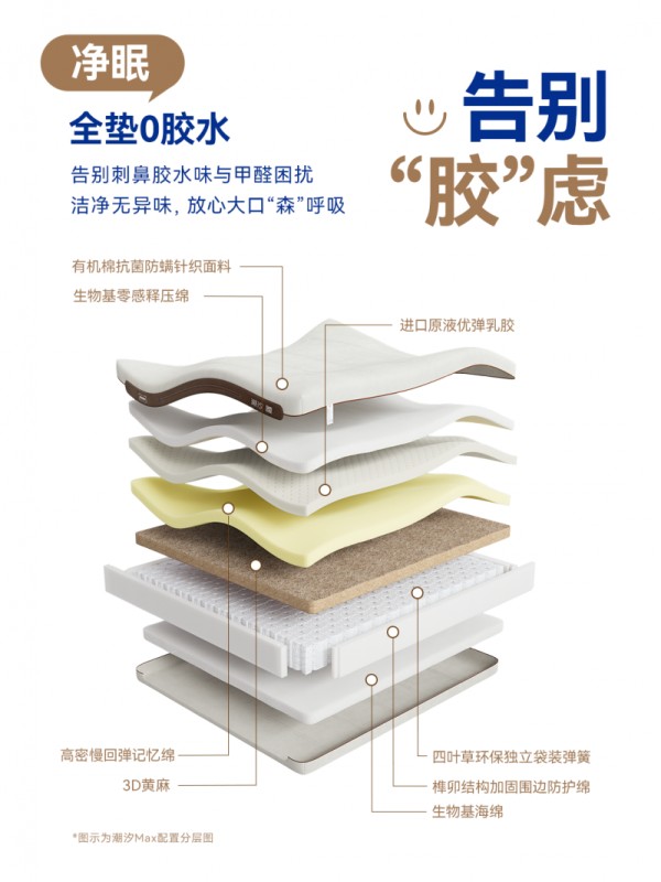 内垫由记忆绵、乳胶、黄麻三层组成,可自由组合出4种不同睡感,满足多样化的深睡需求。