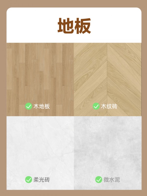 实木地板温润舒适,木纹砖兼顾美观与实用,柔光砖自带柔焦滤镜,微水泥诠释极简魅力。推荐根据空间需求灵活选择地面材质。