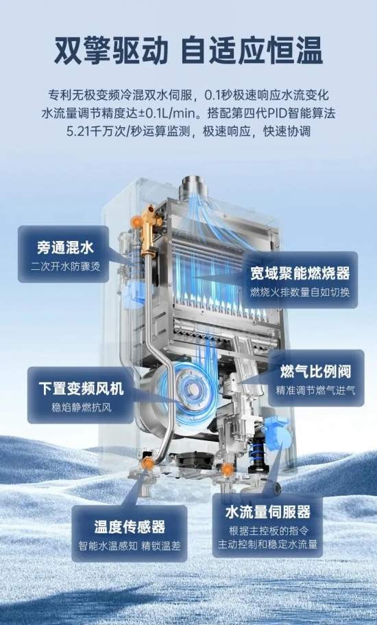 · 稳压:双水量伺服器+微火苗,低水压、低气压也恒温大水量;