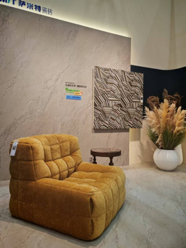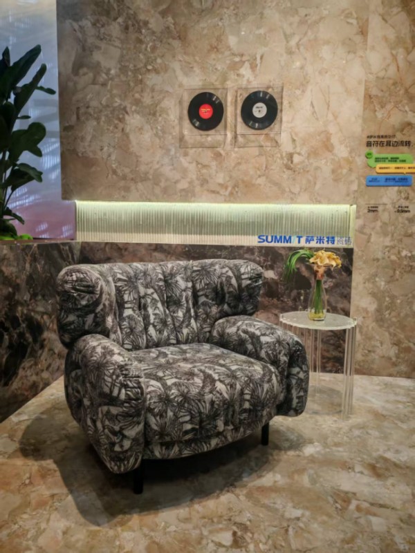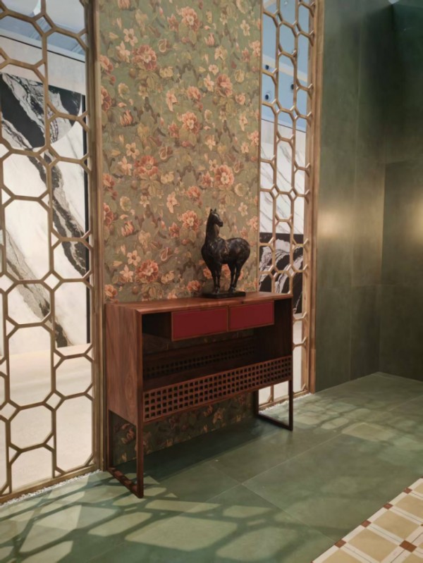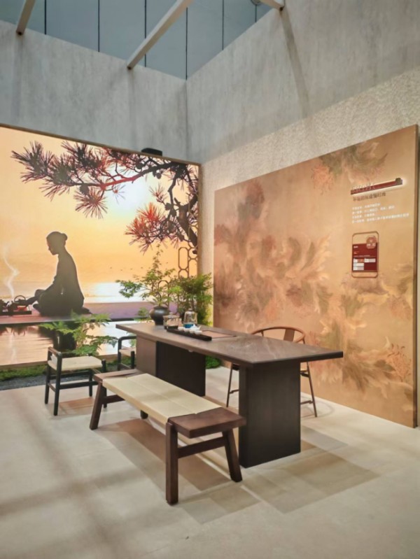 展会现场,双方打破行业边界,从风格、材质到场景全维度协同。兰夕以客厅沙发、北美黑胡桃餐桌餐椅、玄关柜、餐边柜、茶桌等为核心,搭配冠珠瓷砖的国潮肌理,构建含蓄高级、静谧治愈的“东方宅院”,实现宋式传统美学与现代空间的无界共生。卡琳则以经典中古家具,结合萨米特的艺术纹理与柔润质感,打造复古又新潮的个性空间,满足高净值人群的多元审美。全套方案均采用柔性定制,精准适配大宅、会所等场景,兼顾颜值、收纳与实用。