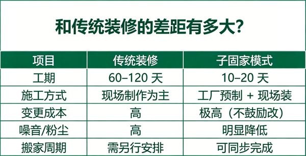 · 工序并行:传统装修是串行(一步一步),子固家改为交叉施工(多工种同步推进);